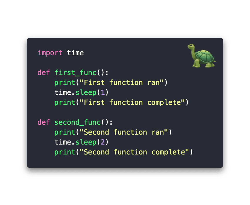 When run sequentially, this script prints a message, waits for a set amount of time (simulating a task), and then prints a completion message. Running this code will take approximately 3 seconds - the sum of the sleep times.
